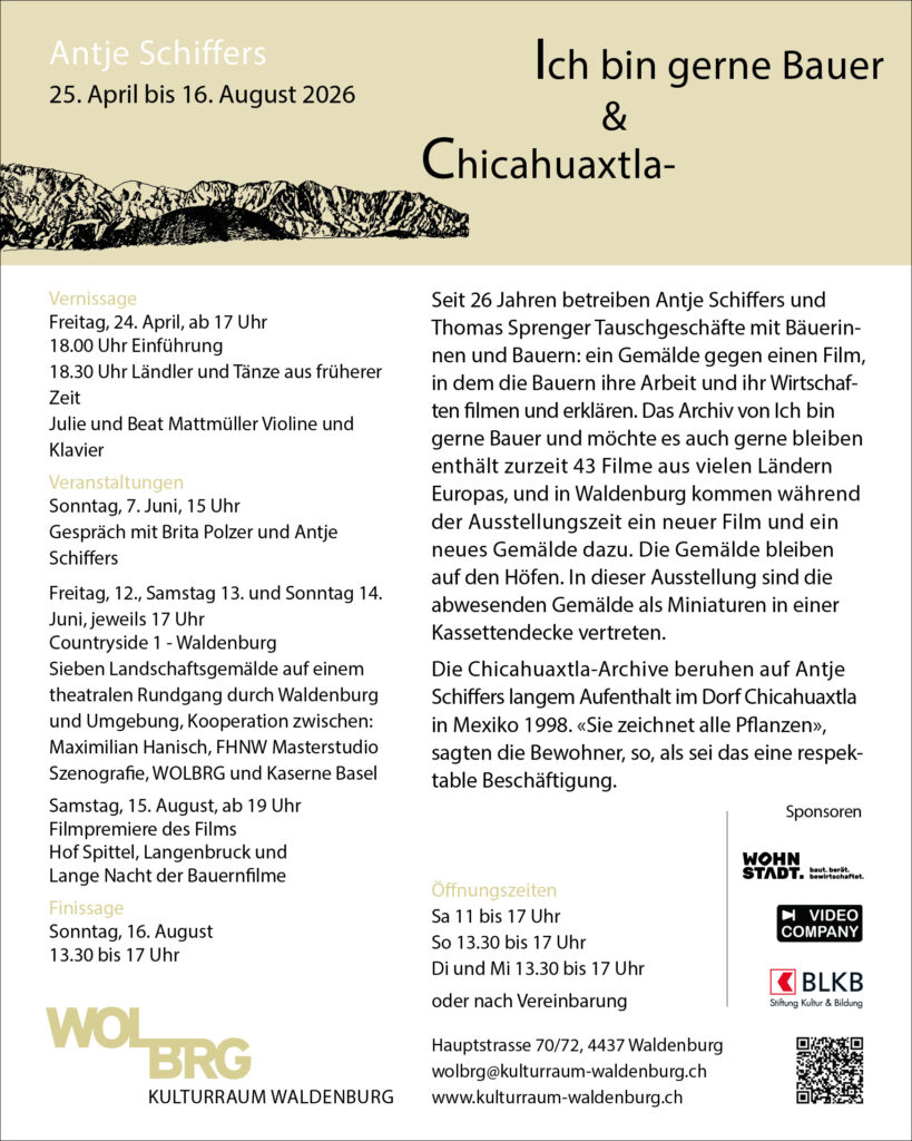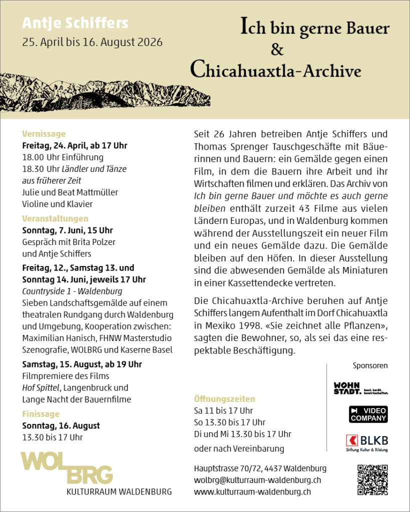 Ausstellungen Ich bin gerne Bauer & Chicahuaxtla-Archive Ausstellung vom 25. April bis 16. August 2026Vernissage: Samstag, 24. April 2026, 14 UhrFinissage: Sonntag, 16. August 2026, 14 UhrMehr Informationen